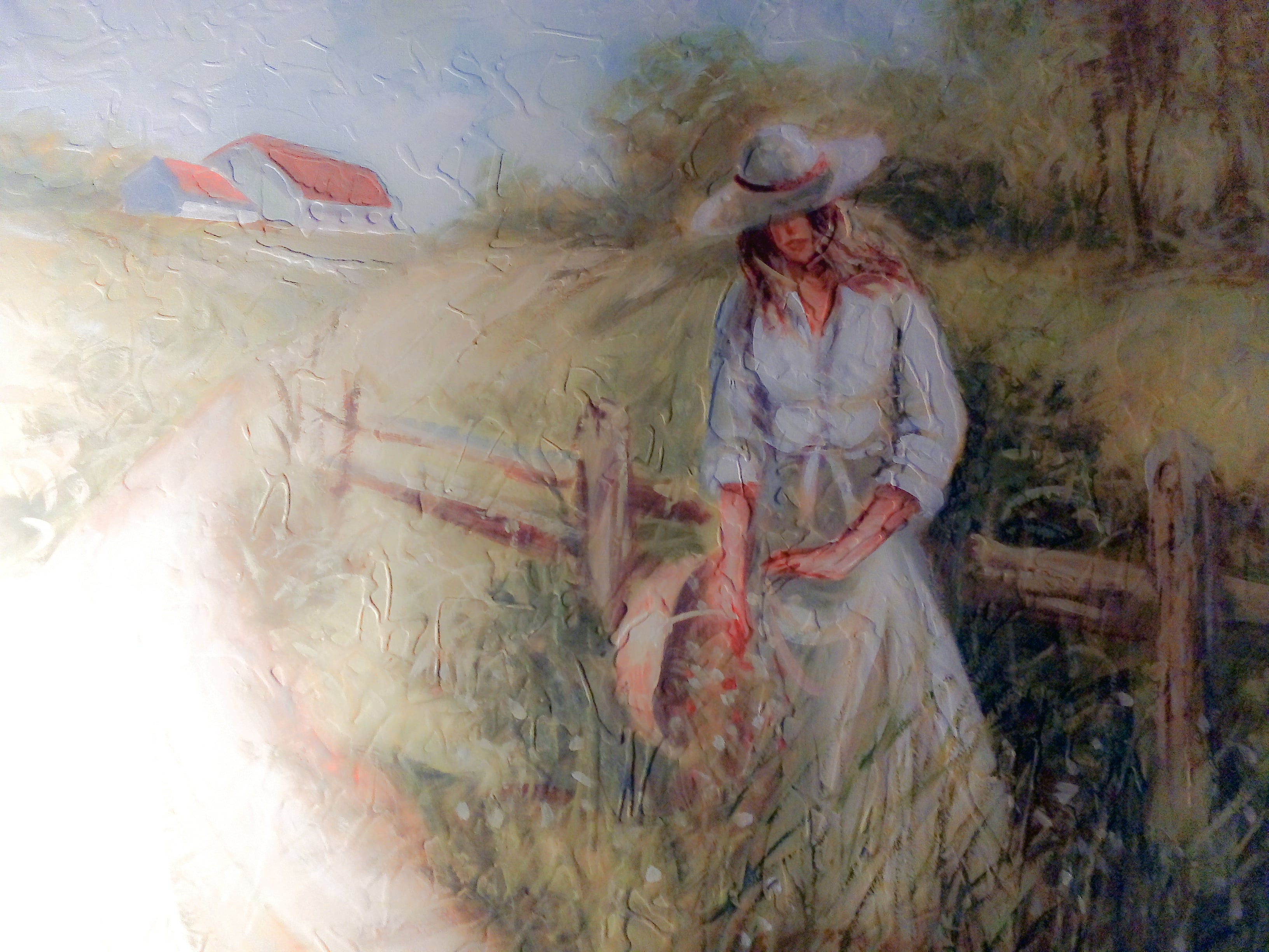 A senhora do quadro veste-se de branco de cima a baixo, não será certamente por acaso: é a pureza do momento. Levantou-se de manhã cedo com o cantar dos animais, ouviu-os pela janela que deixou aberta durante a noite; ainda pensou em fechá-la mas a brisa é tão doce no corpo quente! E o pintor esqueceu-se do medo quando a pintou, quando pintou a casinha e o verde prado, o céu azul e os leves traços que são árvores, arvoredo, uma mancha de vida verde.